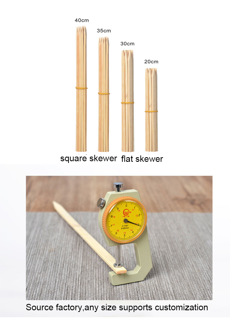 Questi spiedini piatti in bambù all'ingrosso sono venduti in confezioni da 25 pezzi in un unico sacchetto. Sono disponibili in diverse misure: lunghi, medi e piccoli. È possibile marchiare gli spiedini piatti in bambù con il proprio logo.